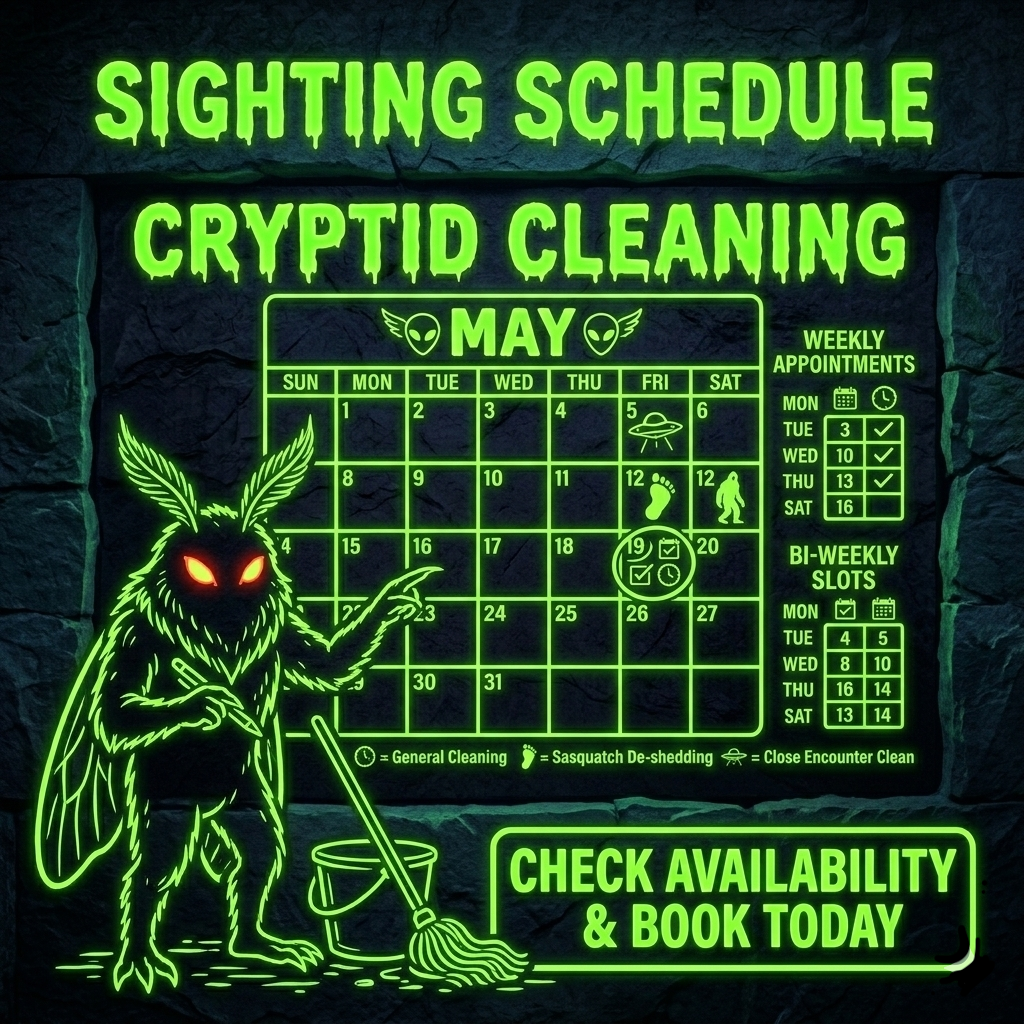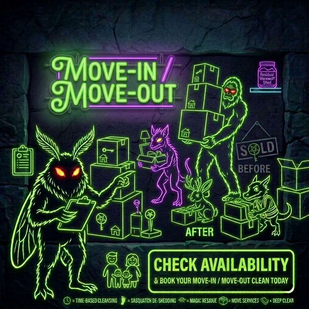 Got a mess that’s truly monstrous? Whether you’ve got Bigfoot-sized mud tracks in the foyer or mysterious slime dripping from the ceiling, Cryptid Cleaning is here to make the grime disappear. Don't let your chores haunt you—reach out today for a quote that won't make you scream.